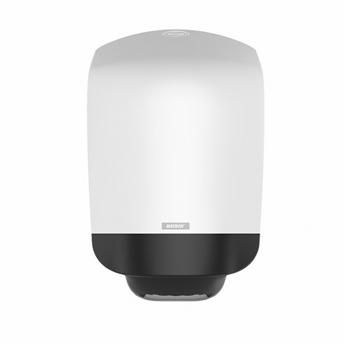 Distributeur bobine dévidage central M Katrin. Facilité et simplicité de mise en place d’un nouveau rouleau grâce à la nouvelle ouverture. Découpe du papier simple, pour bobine 450F. Dimensions 403x263x240mm.