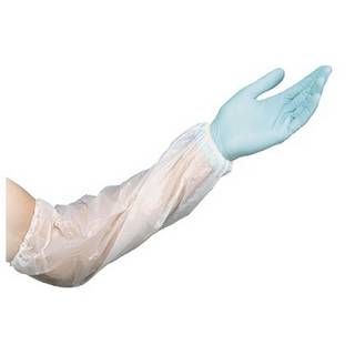 Manchette en polyéthylène blanche à usage unique, avant-bras élastiqué au dessus du coude et au poignet, longueur 40 + 20cm, épaisseur 25 microns. Pour risques mineurs, milieu médical , alimentaire,industrie. Sous-conditionnement 100 manchettes.