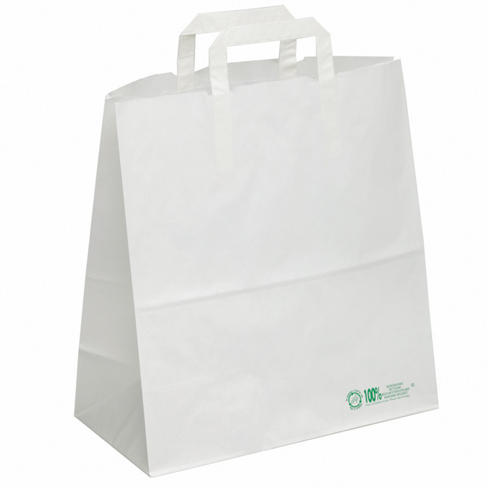 Sac Cabas Kraft blanc de 70gr/m2, à poignées plates, format : largeur 31,7CM, soufflet total à plat 21,8CM, Hauteur 24,5cm. Pour saladiers ou autres contenants supérieurs à 20cm.(31,7+21,8H 24,5)